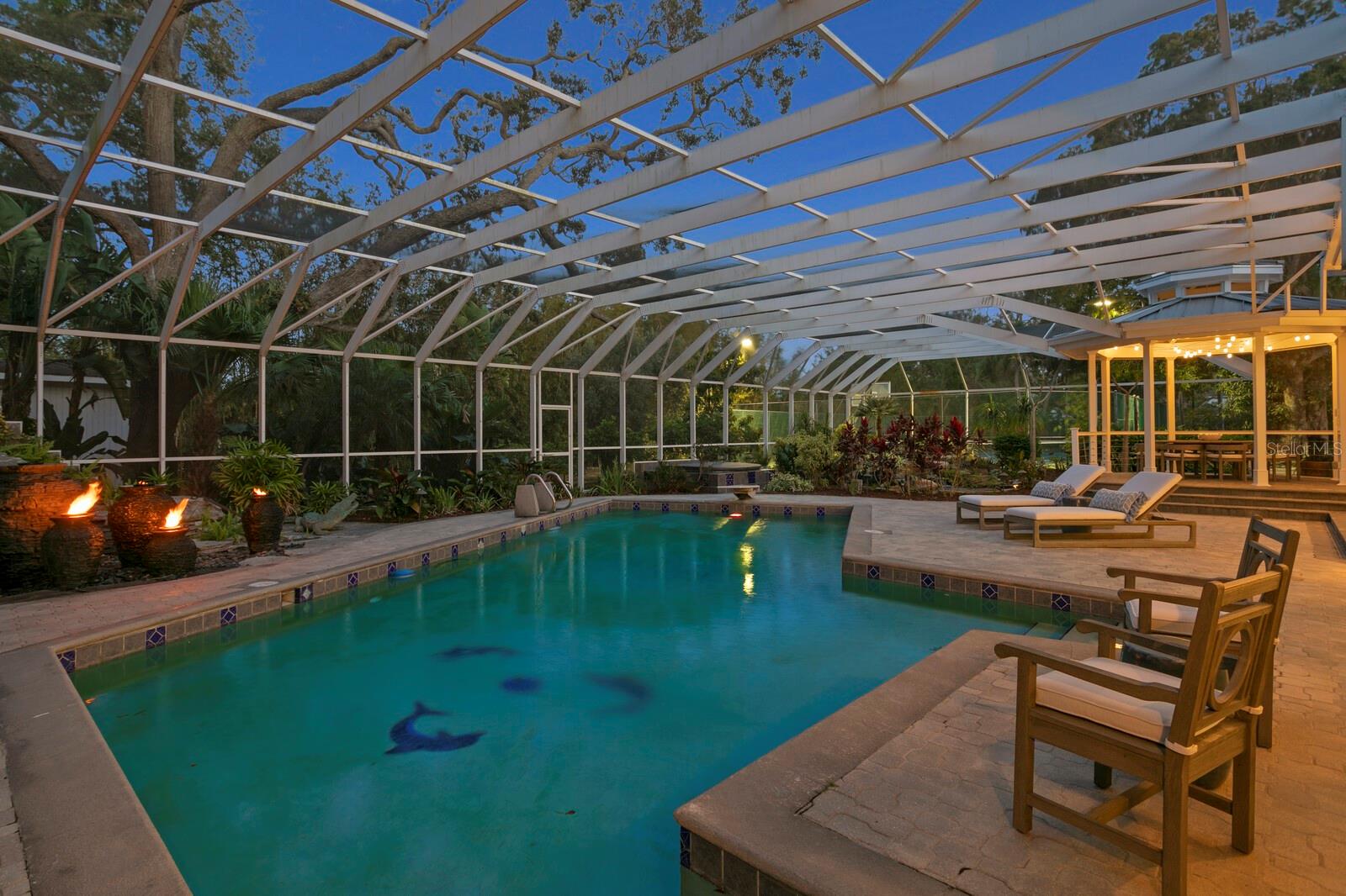 A rare opportunity awaits on the prestigious Edgewater coastline—4.9 acres of elevated coastal elegance spanning two expansive lots with over 226 feet of prime water frontage. This estate is the embodiment of timeless sophistication and enduring craftsmanship, seamlessly blending classic architecture with thoughtful, modern refinement. With a proven history of resilience—remaining untouched by the 2024 storms—it offers peace of mind and enduring value. Each parcel allows for Intracoastal Waterway access, with the option to add a private dock, further enhancing the estate’s waterfront appeal. From the moment of arrival, grandeur and serenity abound. A newly constructed TEK composite porch leads into a residence rich with character—restored original hardwoods, custom millwork, and layered textures create a setting that is both stately and warmly inviting. Multiple living spaces, each imbued with their own ambiance, include a formal music room and a sitting room—both anchored by wood-burning fireplaces—a wraparound-windowed dining room, and a cozy family den complete with custom built-ins and a rolling library ladder. At the heart of the home, the chef’s kitchen is a culinary showcase: six-burner Thermador range, dual Sub-Zero refrigeration, wine fridges, a warming drawer, and a large central island adorned with Swarovski crystal hardware. Underfoot, linen tile floors lead through to a light-filled family room where sliding glass doors open to panoramic water views, creating a seamless transition to the outdoor oasis. Whether hosting grand soirées or enjoying quiet mornings, the home’s built-in bar, casual dining nook, and expansive entertaining areas are thoughtfully designed to elevate every moment. Upstairs, a loft-style corridor with tobacco-printed wallpaper guides you to the guest bedrooms—each spacious and unique—a cork-accented bath, and an elevator that serves all floors for ultimate convenience. The west-facing primary suite is a private sanctuary, complete with fireplace, private sunset balcony, and a spa-caliber ensuite featuring a marble walk-in shower, soaker tub, crystal-inlaid mosaic tiling, and a bespoke dressing room with center island storage. Beyond the main home lies a gracious guest house—with three bedrooms, balconies, a prep kitchen, and its own Generac generator—perfectly suited for visitors or extended stays. A Game Room House offers endless entertainment with a full bar, bath, and ample room for games, while a custom office with floor-to-ceiling cabinetry and balcony provides a serene space for productivity. Outdoors, the estate transforms into a private coastal retreat: a lighted tennis court, koi pond with cascading waterfall, gazebo for al fresco dining, and a resort-style swimming pool with diving board all set within lushly landscaped grounds and gas lantern-lit ambiance. A fully outfitted garage with new laundry, full bath, gym area, and abundant storage completes the offering. With restored windows, natural gas service, and curated luxury finishes throughout, this home is not just a residence—it’s a legacy. With its elevation, privacy, iconic location, and unyielding beauty, it offers a once-in-a-generation opportunity to own a piece of the coast that’s truly irreplaceable. Come see this unique property blocks from the Historic Fenway and 1 mile to downtown Dunedin.