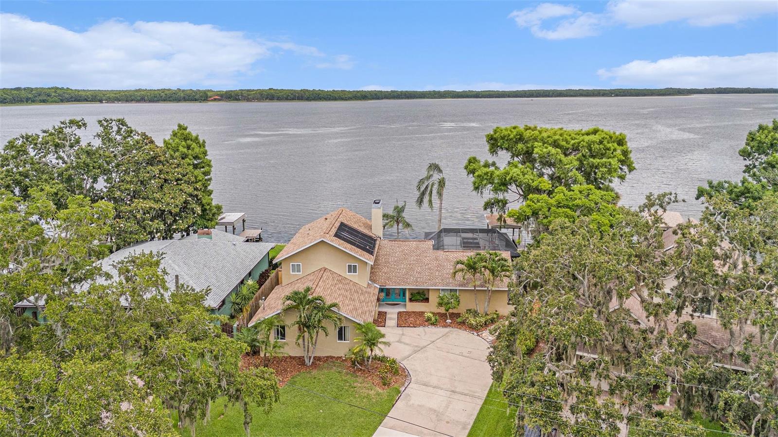One or more photo(s) has been virtually staged. Live the ultimate Florida lakefront lifestyle in this beautifully maintained 4-bedroom, 3-bathroom pool home on the shores of Lake Tarpon! With over 2,300 sq ft of living space, this Palm Harbor gem offers breathtaking lake views from multiple rooms, beautiful sunrise and sunset vistas, and direct lake access with a private dock - perfect for boating, catching bass right off the dock, or simply enjoying the peaceful water. Step through the foyer into a light-filled interior featuring crown molding throughout, living with BRAND NEW wood-look tile flooring, dining room, and a spacious kitchen with granite countertops, abundant cabinetry, matching appliances, and a cozy breakfast nook. The family room features a wood-burning fireplace, custom built-ins, and double sliding glass doors that open to the screened-in pool and panoramic lake views. One bedroom and a full bathroom with a glass-enclosed shower and updated vanity are located downstairs - perfect for guests or multi-generational living. Upstairs, the spacious primary suite impresses with its own fireplace, ceiling fan, private balcony overlooking Lake Tarpon, and an en-suite with a soaking tub, separate shower, and double sink vanity. Two additional bedrooms share a full bath with double sinks and a tub/shower combo. Enjoy endless days outdoors in your private screened-in pool area with multiple seating and dining areas, a covered patio, grill, and a pie-shaped fenced backyard that leads directly to your private dock. Local wildlife like bald eagles and otters frequently visit, adding to the serene atmosphere. The home also features a laundry chute, hidden storage for valuables, two A/C units (2016 & 2022), a large laundry room with extensive storage, and a two-car garage. Nestled in a quiet golf cart-friendly community with a neighborhood park and boat launch, and just minutes from US-19, Innisbrook Golf Course, top-rated dining, shopping, and a short drive to the Gulf beaches - this is a rare opportunity to own a true Lake Tarpon retreat. Don’t miss it!